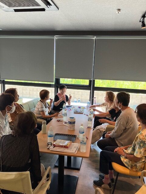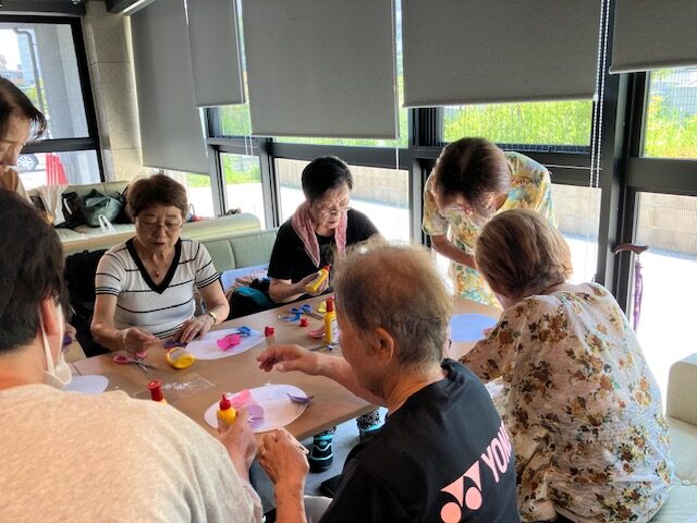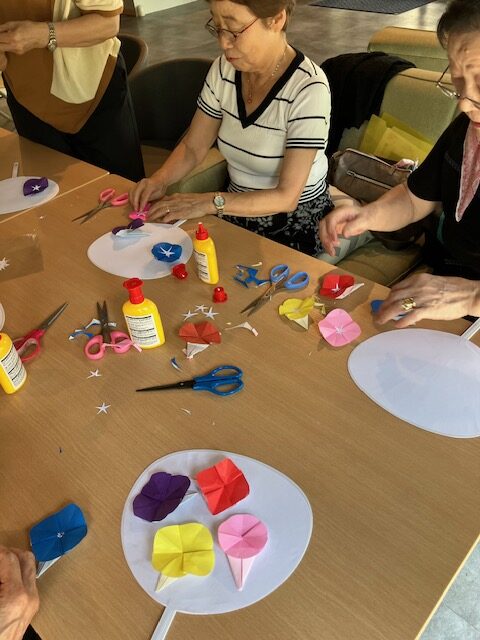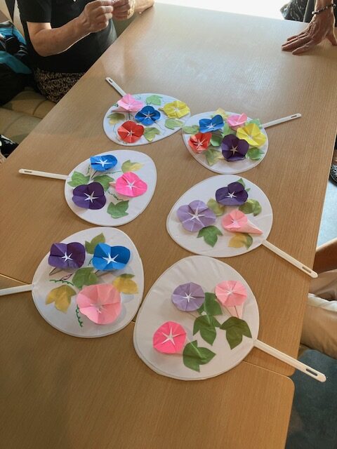 【報告】福祉の森サロン「ご近所さんの居場所」2025.8.4 2025年8月5日 最終更新日時 : 2025年8月5日 サイト管理者 8月4日月曜日、10:30~12時 優っくり村板橋栄町交流スペースで実施しました。 今回の居場所は参加者が12名。猛暑の中、皆さんお集まりいただきました。 夏らしいうちわを手作りしました。 白いうちわにお好きな色紙でアサガオを折り、うちわ一面に貼り付けました。 皆さんのセンスが光る作品になりました。 皆さん、お菓子をいただきながら、お喋りの時間を何よりも楽しみにしているそうです。 ☆一部の方々の写真と作品をご紹介します。