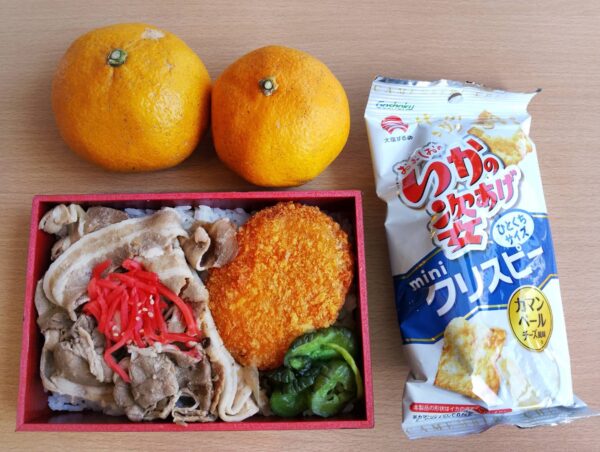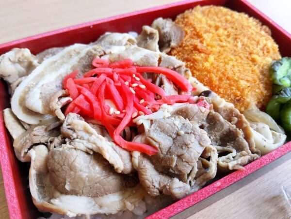 今回は、牛丼に、アジフライ、コロッケ、メンチカツ、白身フライの4種類から一つ、加えてキューリ漬物、紅生姜…などなど盛りだくさんのお弁当でした。