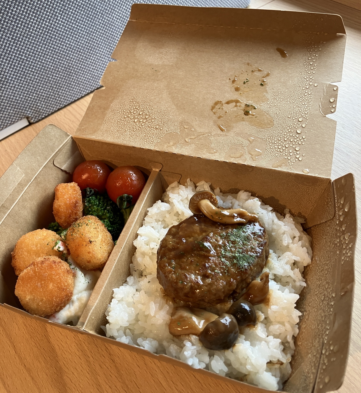 今日は、しめじ煮込みハンバーグ、ポテトサラダ、チーズポテトフライ、ブロッコリー、ミニトマトのお弁当でした。