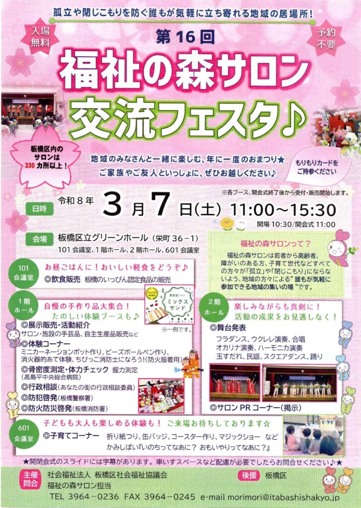 3月7日(土)11:00〜15:30、板橋区グリーンホールで、社会福祉法人板橋区社会福祉協議会主催による 第16回 福祉の森サロン「交流フェスタ」が開催されます。