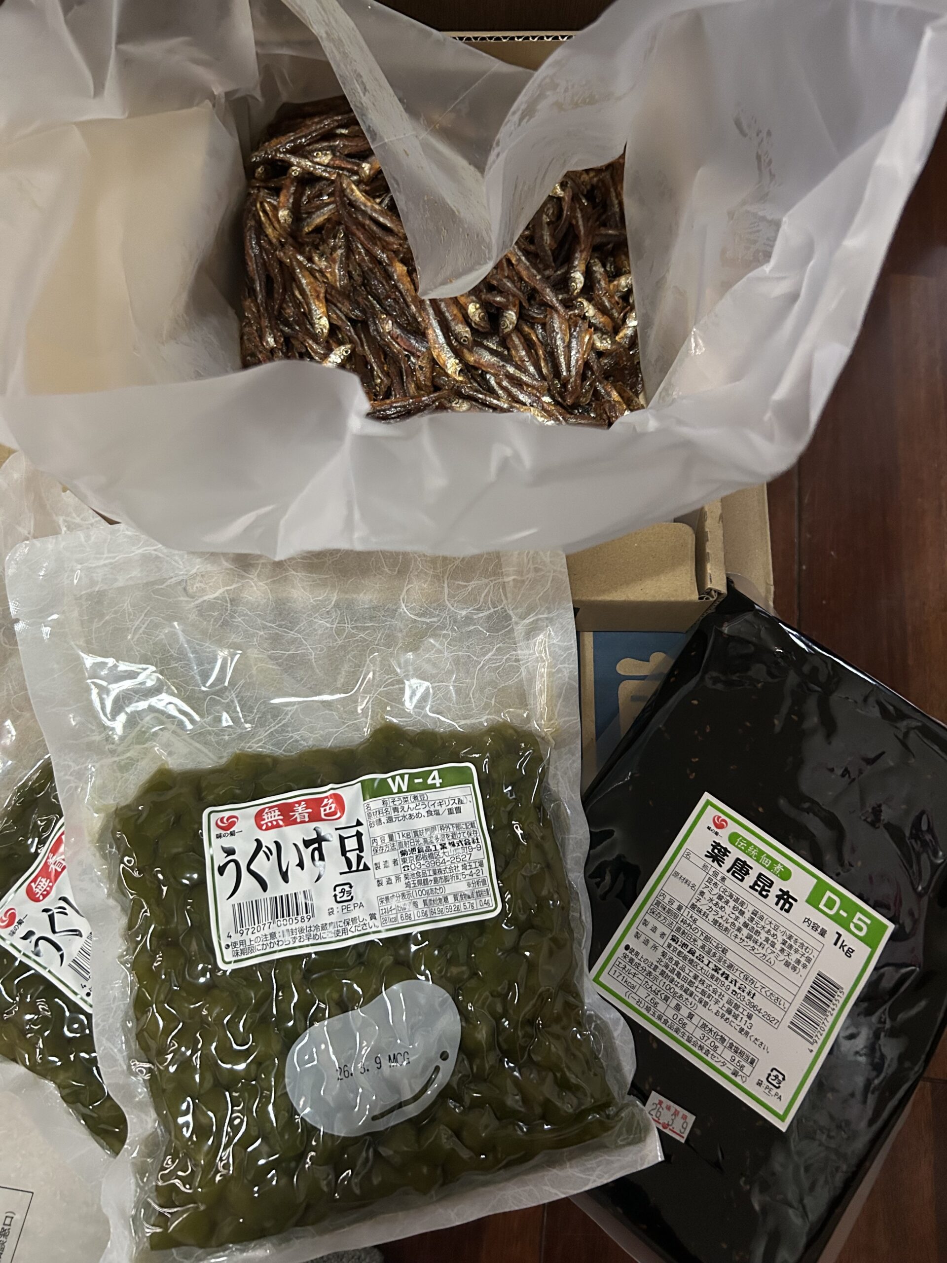 ワカサギの甘露煮、葉唐辛子、うぐいす豆は、菊池食品様からの寄贈品です。